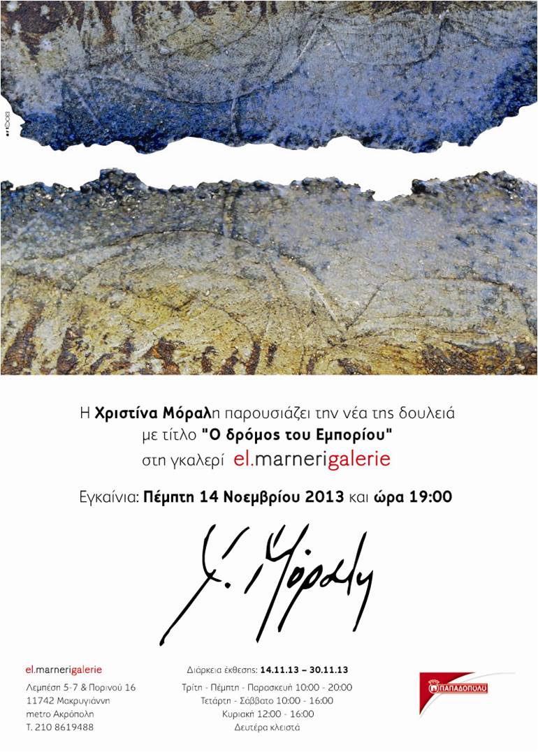 «Ο δρόμος του Εμπορίου» είναι ο τίτλος της τελευταίας δουλειάς που παρουσιάζει η Χριστίνα Μόραλη στην γκαλερί Ελένη Μαρνέρη. Ο χώρος της γκαλερί βρίσκεται κάτω από τον βράχο της Ακρόπολης με εμφανή αρχαία ευρήματα κάτω από το γυάλινο πάτωμά της! Υπάρχει πληροφορία ότι πιθανόν στην αρχαία Αθήνα από την περιοχή πέρναγε ο «δρόμος του εμπορίου» και κατευθύνονταν στον Πειραιά.