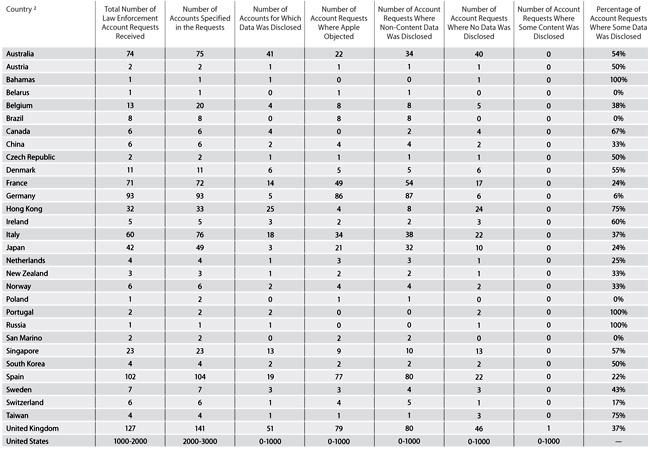 Στην κορυφή της λίστας βρίσκονται οι ΗΠΑ, καθώς ζήτησαν δεδομένα για 2.000 με 3.000 λογαριασμούς. Τα αιτήματα κυμάνθηκαν από 1.000 έως και 2.000. Ωστόσο, πληροφορίες δόθηκαν τελικά για 0 έως 1.000 λογαριασμούς που βρίσκονταν κυρίως στο iTunes αλλά και στο iCloud.