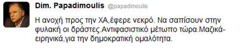 «Η Χρυσή Αυγή προσηλωμένη στις αιώνιες αξίες του Ελληνισμού, θα συνεχίσει να αποδίδει τιμές στους Πατέρες, ξυλόσομπες με λέβητα και φούρνο την αισθητική και τα σύμβολα που γέννησε ο αρχαίος ελληνικός κόσμος και συνεχίζουν να εμπνέουν ακόμα και στο άχρωμο σήμερα.», καταλήγει.